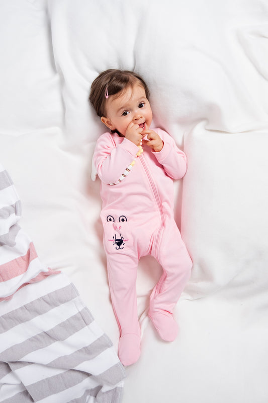 Solid On-the-Go Zipper Jumpsuit with Non-Slip Footies with Embroidered Pocket - Pink