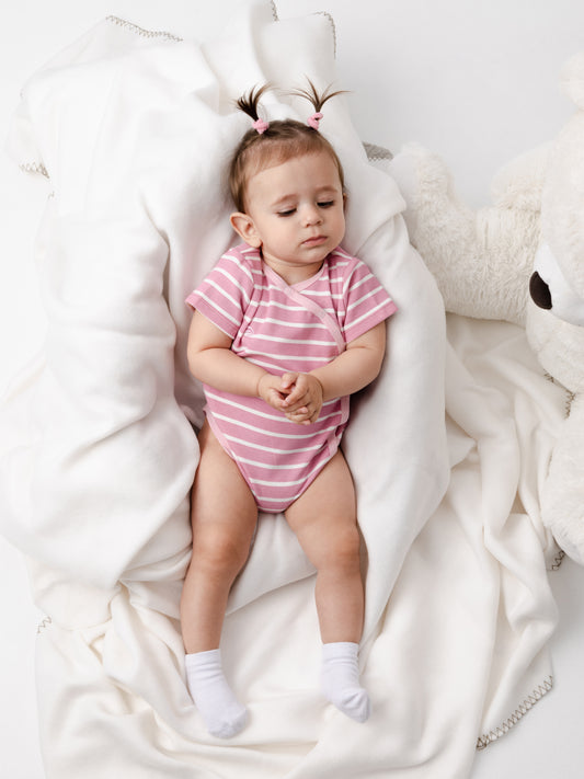 Short Sleeve Wrap Front Bodysuit with (Mini Stripe) Pattern - Raspberry