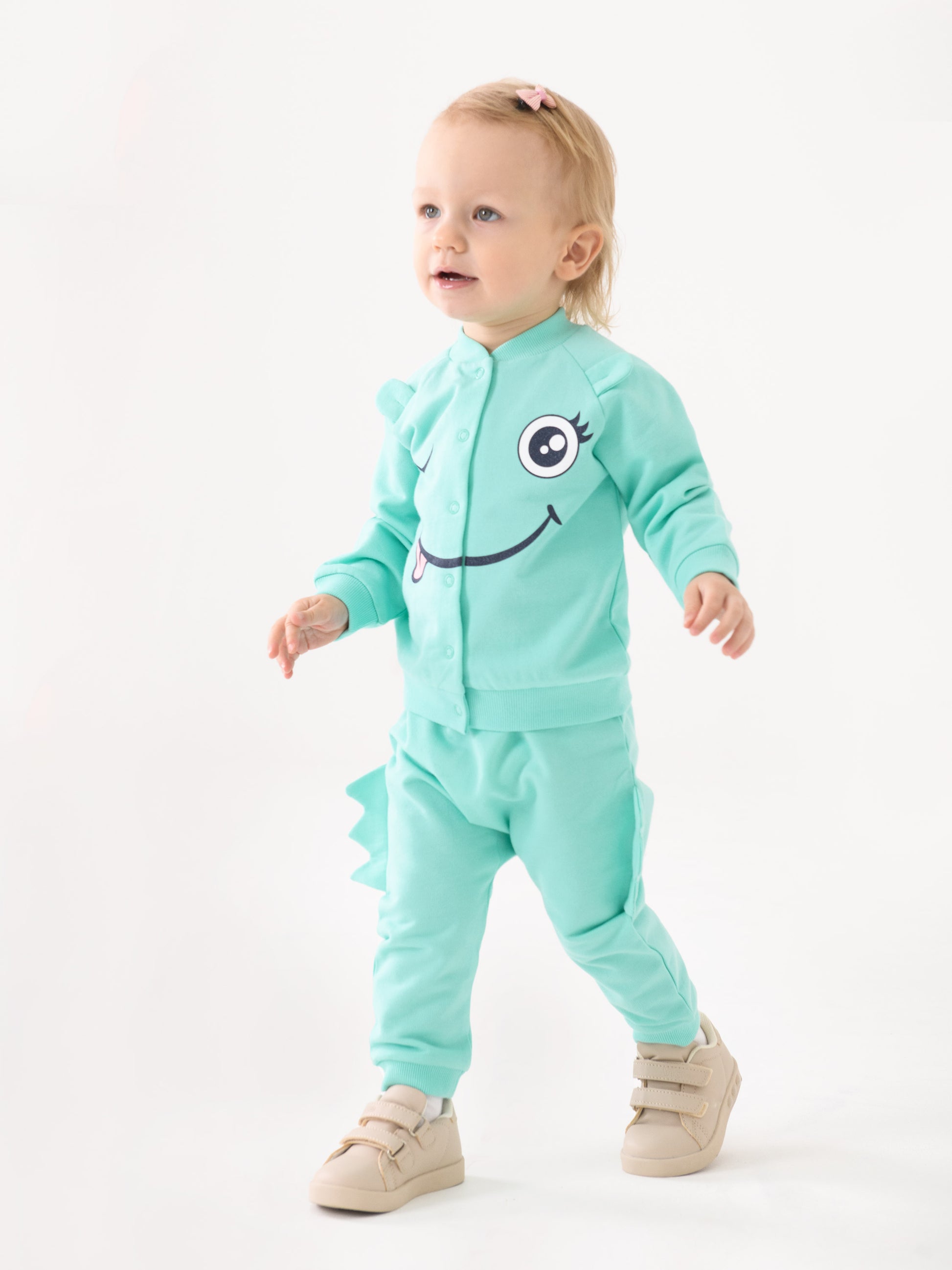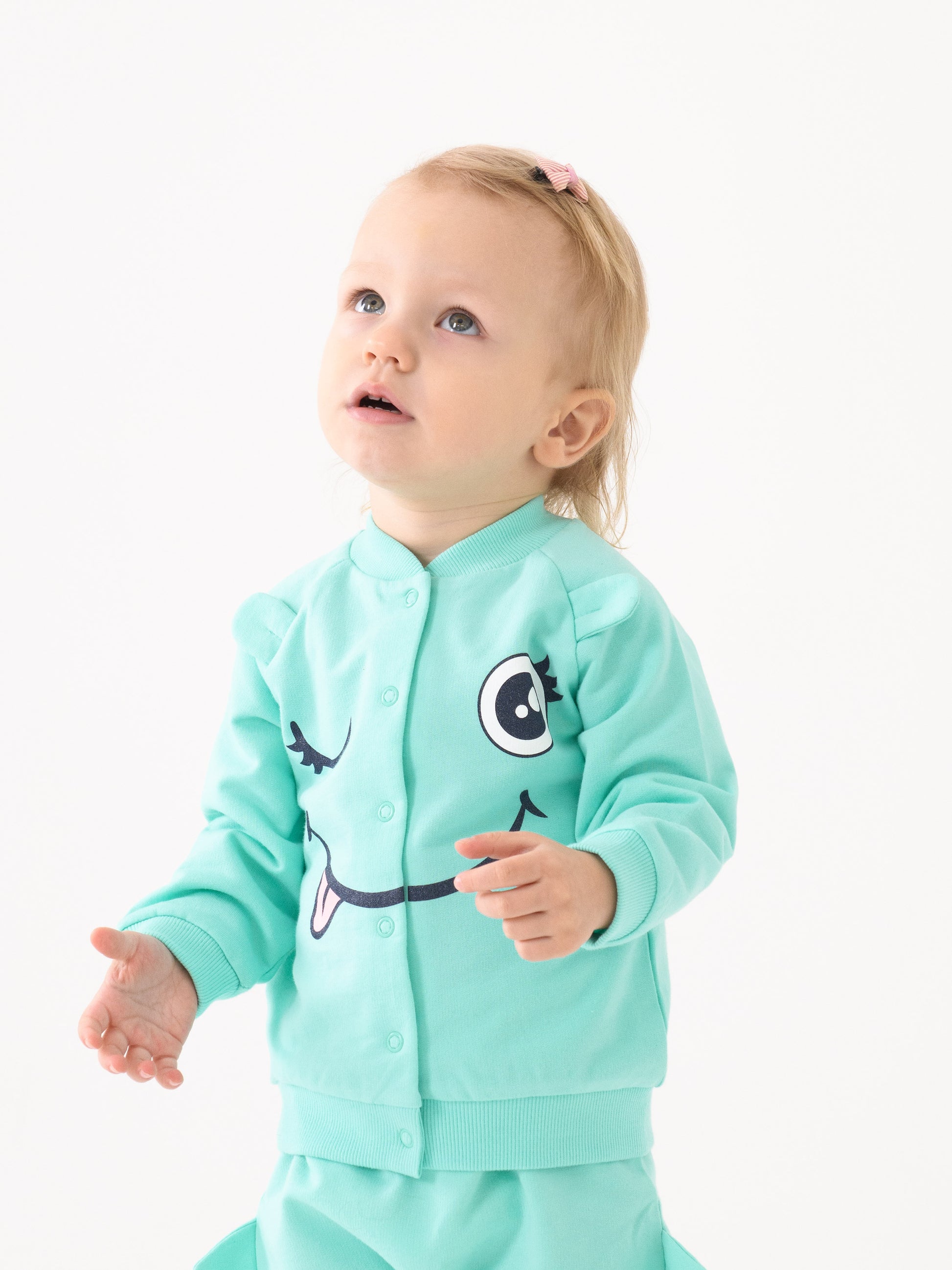 Feeling the need to get your little one something cozy and cool, but don't have time for shopping? You're in luck! This bomber jacket is an instant fix - ideal for kids with its perfect, comfy fit, this stylish bomber will keep your angel nice and warm. The material is 100% natural cotton and feels soft to the skin. Illustrated with a friendly green monster face on the front and two cute ears, this bomber in eye catching mint color is the perfect add on for the season.